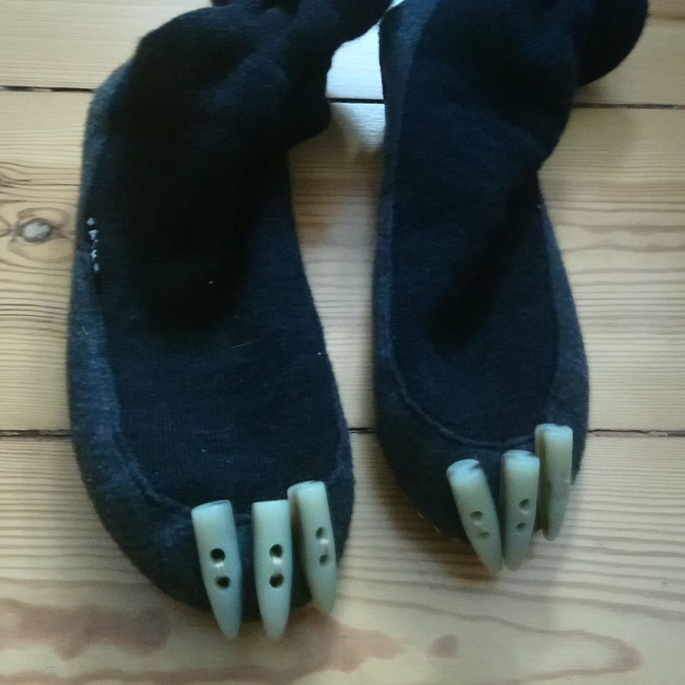 gebastelt, auf denen je drei Hornknöpfe die Krallen eines Dreizehenfaultiers