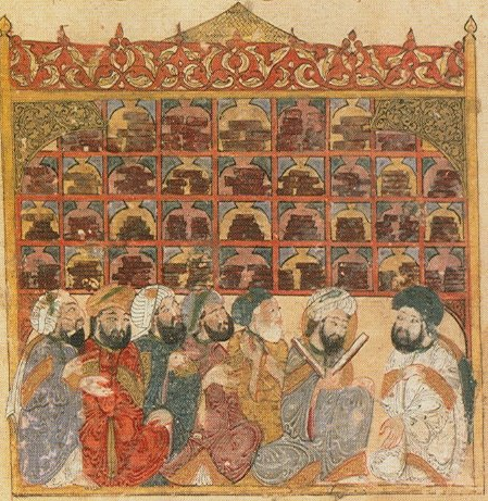 Bild: Bibliothek mit Lehrer und Schülern (Yaha al-Wasiti, 13. Jahrhundert, Wikimedia Commons)