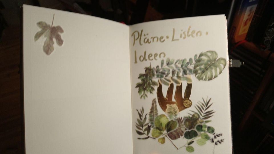 Bild: Mit Blättern und einem Faultier dekorierte Titelseite mit der Aufschrift "Pläne, Listen, Ideen"
